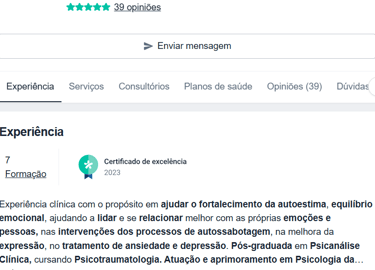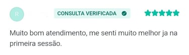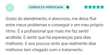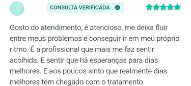 "As consultas tem me ajudado a me manter mais calma, conviver melhor com meus medos e ter qualidade de vida. E a profissional em questão também me faz se sentir segura para falar abertamente sobre tudo"