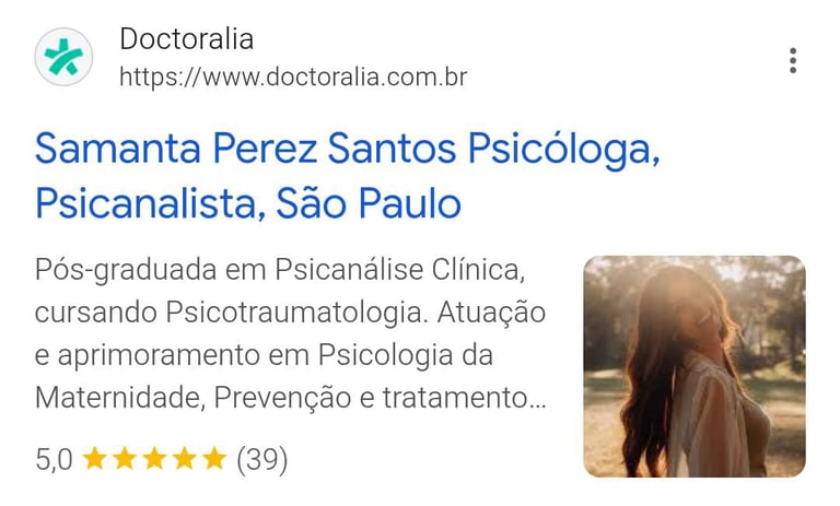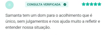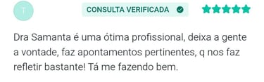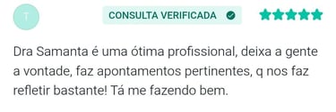 "Sobre o atendimento da psicóloga Samanta, eu sou suspeita em falar pois está me ajudando muito no meu auto conhecimento, sinto que estou conseguindo evoluir a cada sessão de terapia com as nossas conversas e reflexões! Eu indico a terapia e principalmente com a psicóloga Samanta"