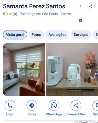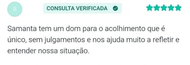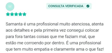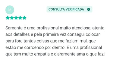 "Samanta é uma profissional atenciosa, acolhedora e extremamente talentosa no que faz! Me identifico muito com a sua forma de trabalho, reflexões, e sempre me sinto muito bem durante as sessões. É uma experiência única, tenho percebido minha mudança diariamente. Além disso, o local de atendimento é maravilhoso!"