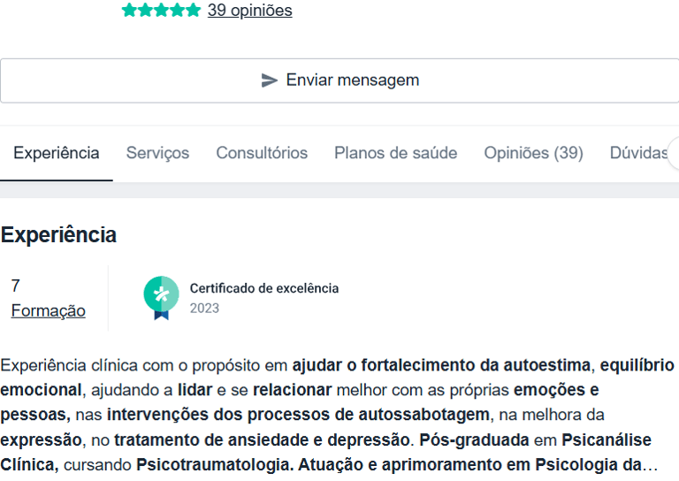 "Excelente atendimento. Proporciona um ambiente de confiança, possui um vasto conhecimento técnico na área e direciona de forma extremamente respeitosa a sessão!"